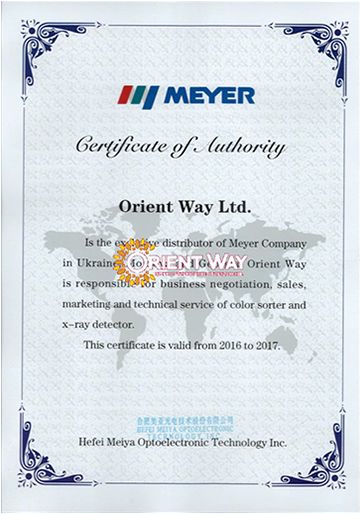18 лет сортировочное оборудование TM "MEYER" на рынках Украины, Грузии и Республики Молдова официально поставляет эксклюзивный представитель Hefei Meyer Optoelectronic Technology Inc. в этих странах, украинская компания "Ориент Вей".